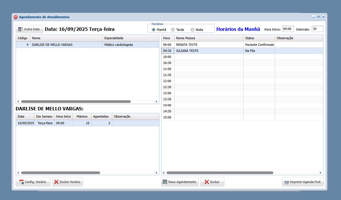 Agende consultas com datas futuras, e até mesmo para múltiplos profissionais. Acompanhe o status de cada paciente em tempo real, definindo se ele está na fila, confirmado ou finalizado. Além disso, o VisionMed permite definir o tempo entre os atendimentos, controlar os horários de início e garantir uma organização eficiente de todos os processos, desde o agendamento até o atendimento. Simples, prático e completo para você ter mais controle e oferecer uma experiência de qualidade para seus pacientes.